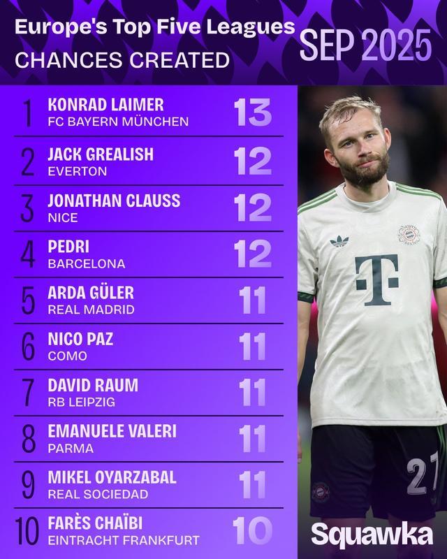 10月1日,数据机构Squawka发布了9月的统计数据,拜仁的后卫Lemmer在9月创造了13次机会,该机会首先排名前五名。所有的愤怒,佩德里(Pedri)和克洛斯(Klos)在9月创造了12个机会,并列入了名单。 The five major leagues created opportunities in September, Lemel (Bayern), 13 times gralish (Everton), 12 times Pedri (Barcelona), 12 times near (beautiful), 12 times guerrilla (real Madrid), 11 times Nico Pas (Como) 11 times Raum (Leipzig) 11 times Vali (Parma) 11 times Oyasaval (Real Sociiedad) 10 times [migu exclusive Premier League]